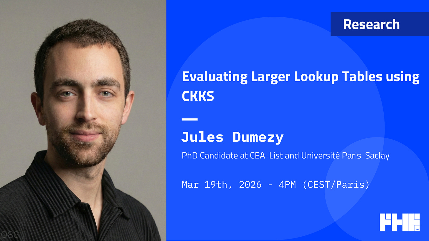 This meetup features Jules Dumezy, a PhD candidate at CEA-List and Université Paris-Saclay, France, presenting Evaluating Larger Lookup Tables using CKKS.